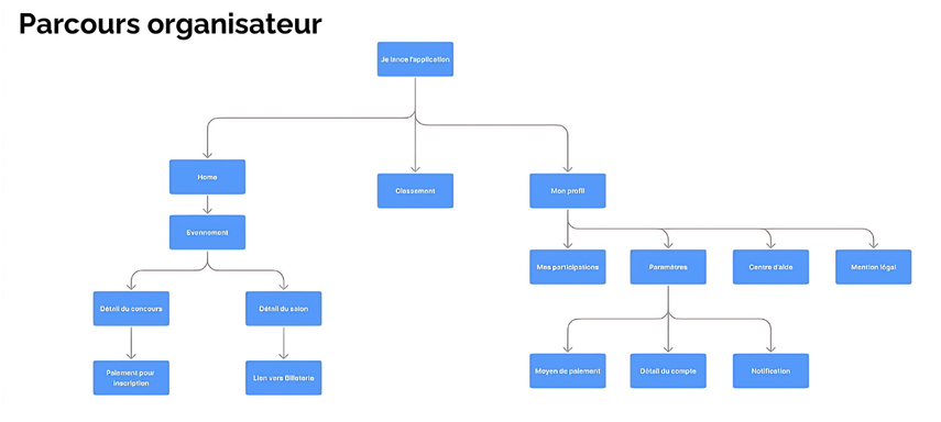 - Pour les organisations : Création et gestion de compte, publication et gestion des événements, gestion des classements des concours, consultation des statistiques d'activité.